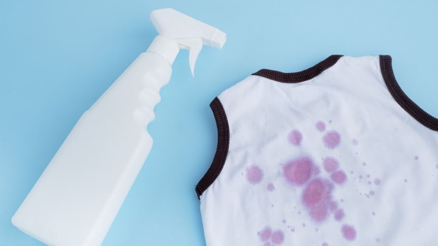 Nastříkejte na skvrnu lak a nechte působit. Po asi 5 minutách otřete houbičkou namočenou v mýdlové vodě a nakonec dejte klasicky vyprat do pračky.